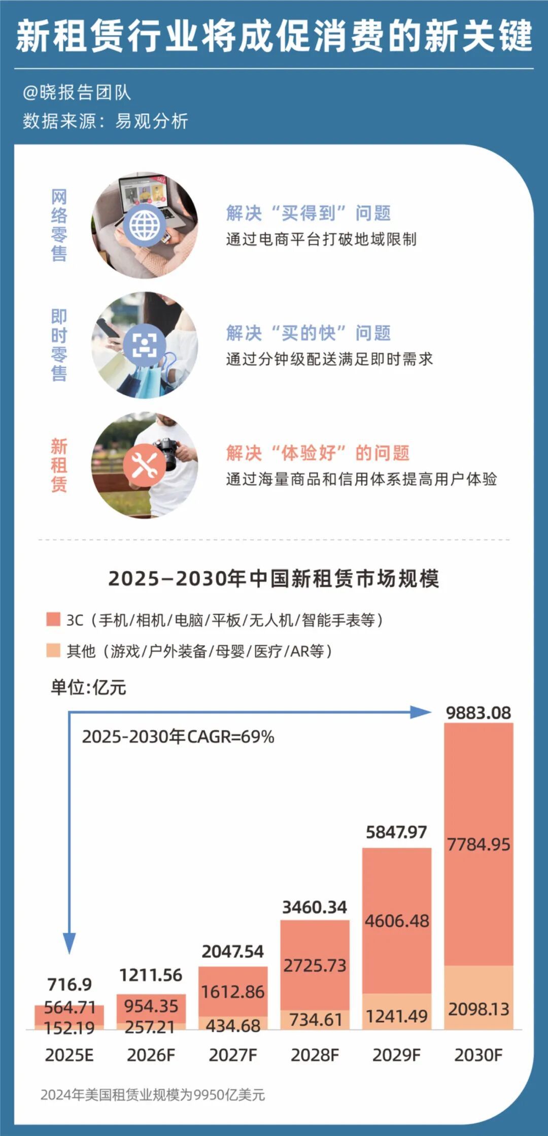 易觀分析給出了更明確的預(yù)測:到2025年底,中國新租賃市場規(guī)模將達(dá)到716.9億元;到2030年,有望接近1萬億元,這5年間的復(fù)合增長率高達(dá)69%。
