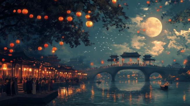 祭月、賞月的習俗走向民間后,逐漸褪去了神圣性和抒情性,演變成了渴望團聚、幸福的拜月習俗。中秋節(jié)成為了和春節(jié)一樣具有世俗情趣的傳統(tǒng)節(jié)日。有了這個節(jié)日,民間就多了一個狂歡的理由和機會,這對終年勞作的人們來說是一種生命的釋放?!稏|京夢華錄》記載:“中秋節(jié)前,諸店皆賣新酒,貴家結(jié)飾臺榭,民家爭占酒樓玩月,笙歌遠聞千里,嬉戲連坐至曉?!币故型ㄏ鼱I業(yè),游人通宵不斷,這都是拜月帶來的熱鬧景象。