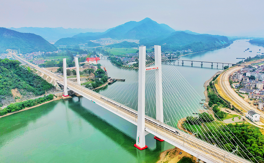 一列復(fù)興號列車駛過合杭高鐵富春江特大橋。 周圍 攝