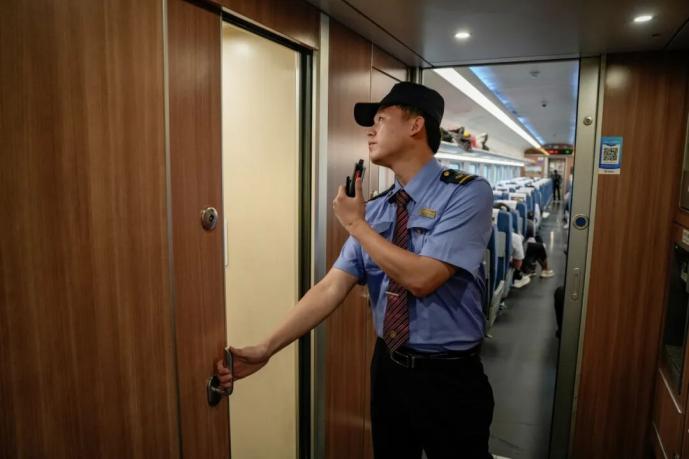 列車疾速奔馳,隨車機(jī)械師每隔2小時(shí)巡視一次全列車廂。巡視作業(yè)完成后,他還要回到位于列車中部的機(jī)械師室,實(shí)時(shí)監(jiān)控動(dòng)車組運(yùn)行及設(shè)備工作狀態(tài),及時(shí)發(fā)現(xiàn)并處置各類突發(fā)問題。