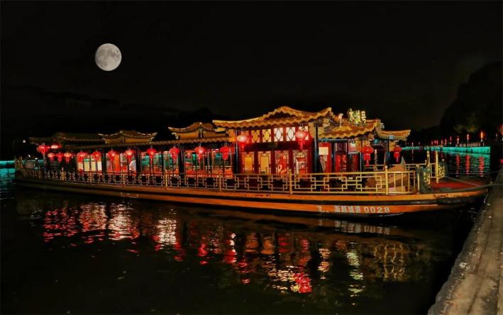 環(huán)城河畫(huà)舫與月亮 越牛新聞?dòng)浾?章斌/攝