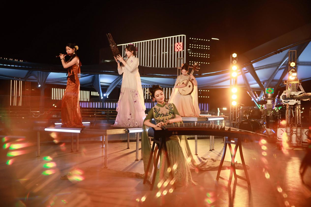 在《仙樂來臨》節(jié)目中,藝術(shù)家和機器人樂隊共同演奏,滴水湖上呈現(xiàn)“七星伴月”的壯闊唯美場景。