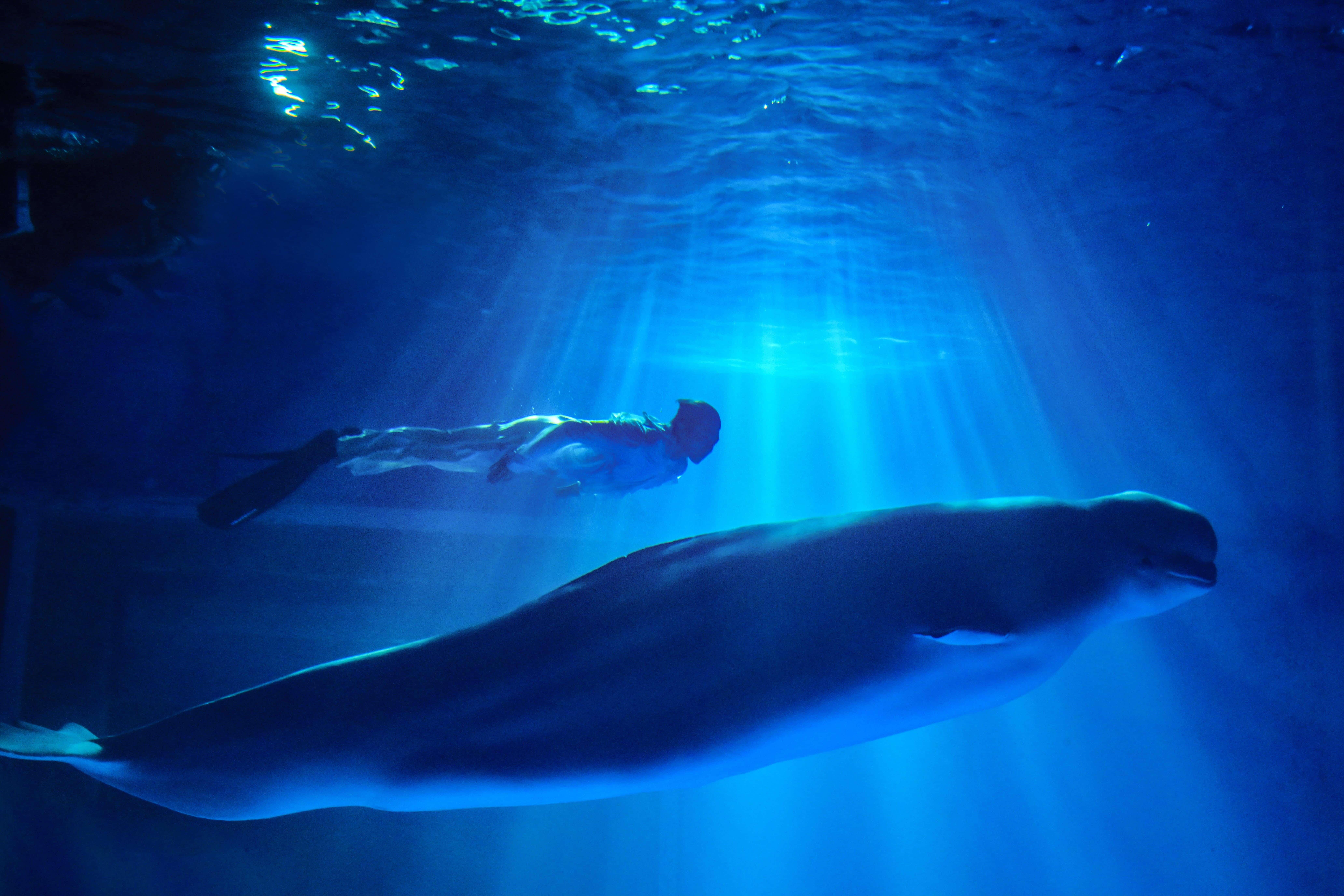 夢幻水舞秀《魚·悅》的靈感源于臨港的真實事件——一尾幼年藍鯨擱淺在臨港海灘,在當?shù)厥忻衽ο卤唤饩炔⒎艢w東海。