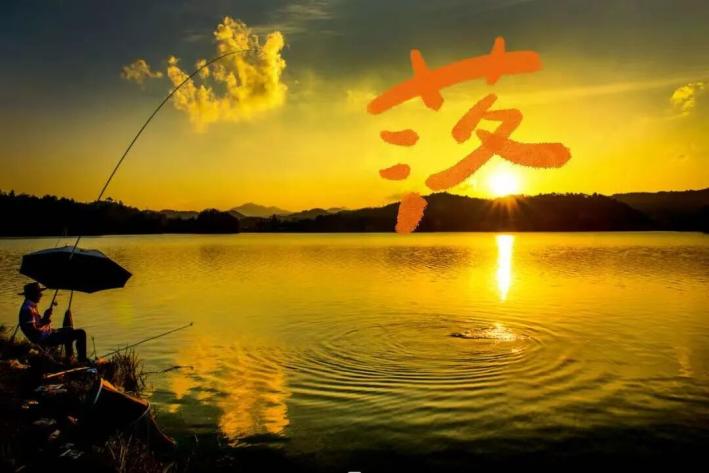 依著山川湖水,盡情談笑??聪﹃柭鲁?,「落」字暈染出霞光,浪漫的落日在眼前變幻著天空的色彩,灑在水面上,波光粼粼,像是水里灑下了星光,講述著金色的故事。