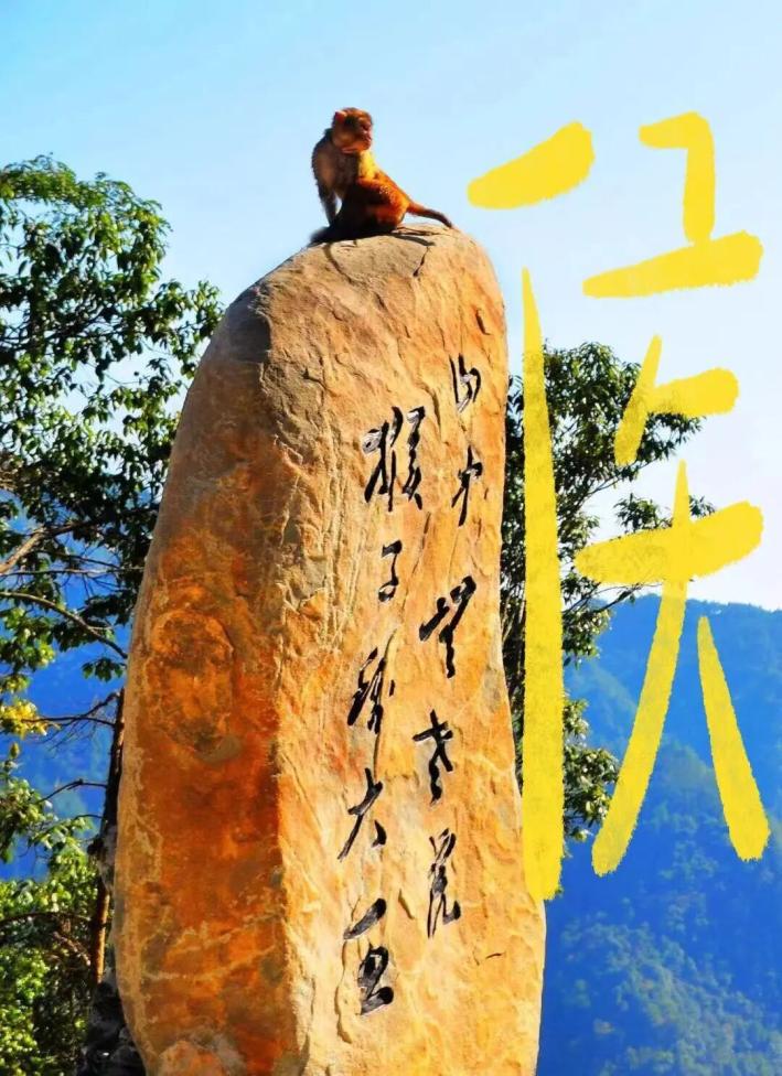 一方石碑傲然挺立,石上墨韻蒼勁。一只獼猴悠然端坐碑頂,靈動的身姿與石碑上的文字相得益彰。四周樹木蔥蘢、遠(yuǎn)山如黛,這種天然與人文的融合,讓猴王谷的「猴」韻更加靈動,仿佛在訴說著山間靈猴與這片秘境的千年緣分。