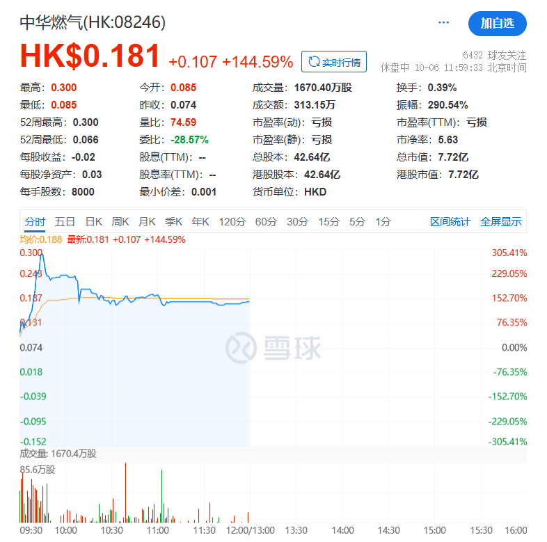 中華燃?xì)庠绫P沖高,一度漲超305%,隨后震蕩調(diào)整,截至午間收盤,該股漲144.59%。