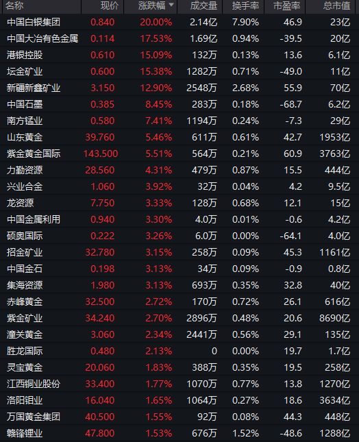 貴金屬概念股持續(xù)上揚,中國白銀集團(tuán)大漲20%,紫金黃金國際、山東黃金、招金礦業(yè)等跟漲。