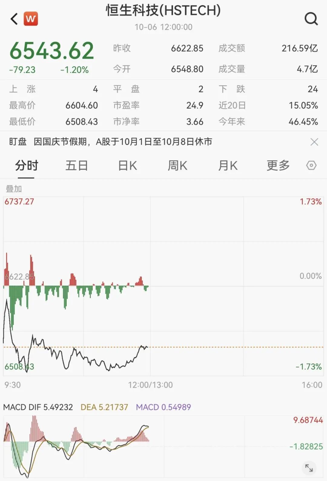 10月6日,港股市場震蕩走低,恒生科技指數(shù)跌超1%。