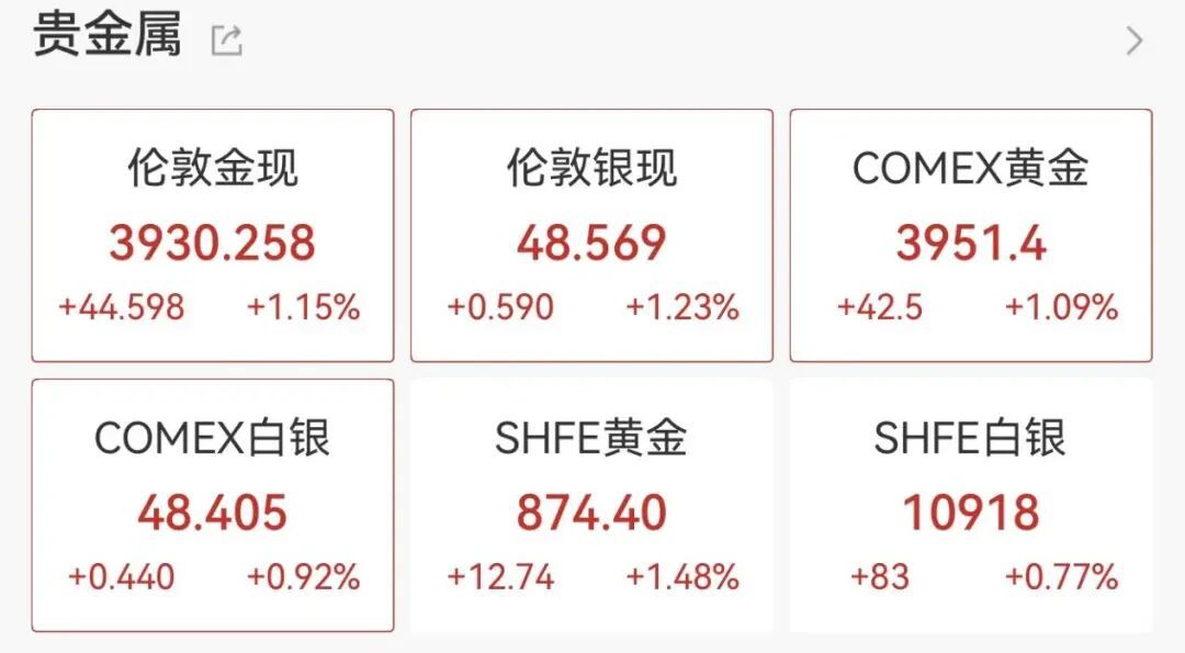 消息面上,現(xiàn)貨黃金持續(xù)拉升,日內(nèi)漲幅達(dá)1.15%,報3931美元/盎司,刷新歷史新高;COMEX黃金期貨主力最新報3951.4美元/盎司,日內(nèi)漲1.09%;現(xiàn)貨白銀日內(nèi)漲幅達(dá)1.23%,現(xiàn)報48.57美元/盎司。