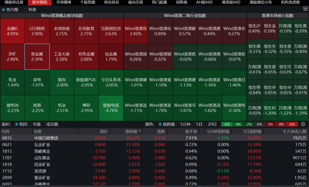 不過,港股市場也有亮點。貴金屬板塊漲幅居前,上漲2.39%。中國白銀集團上漲18.57%,壇金礦業(yè)和珠峰黃金漲幅分別達15.38%和15.13%,山東黃金、招金礦業(yè)等個股漲幅也較為突出。