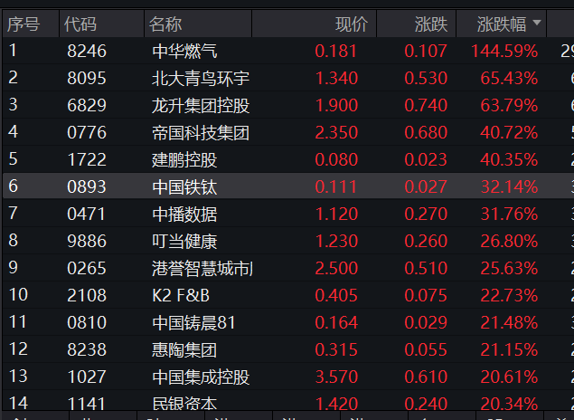 此外,中華燃氣(08246.HK)一度大漲超300%,早盤收盤仍漲144.59%,股價報0.181港元/股。該公司此前公告,10月3日(交易時段后)與認購人訂立認購協(xié)議,認購人有條件同意認購,公司有條件同意配發(fā)及發(fā)行3.34億股認購股份,認購價為每股0.075港元,較10月3日收盤價每股0.074港元溢價約1.35%。北大青鳥環(huán)宇和龍升集團控股漲幅分別達65.43%和63.79%。
