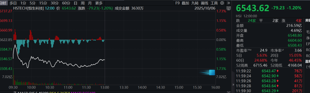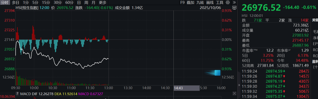 10月6日,港股持續(xù)調(diào)整。恒生指數(shù)低開后震蕩下行,盤中最大跌幅達0.93%,隨后有所反彈。早盤收盤時,恒生指數(shù)報26976.52點,下跌0.61%。恒生科技指數(shù)走勢類似,早盤收盤跌幅為1.2%。