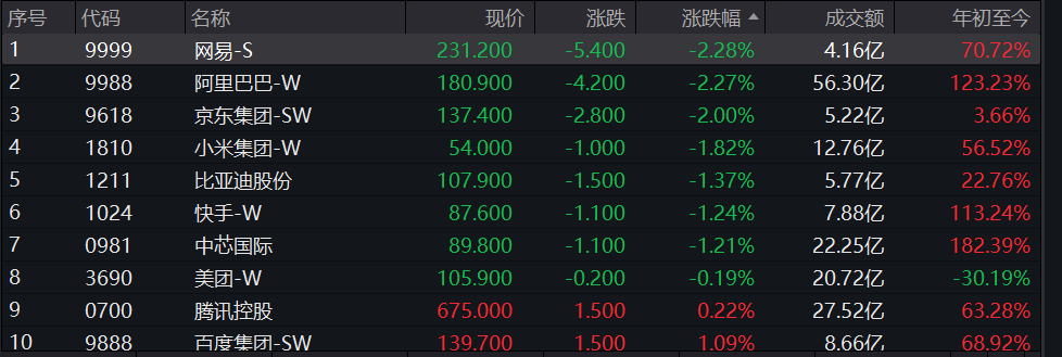 港股科技龍頭股表現(xiàn)分化。網(wǎng)易、阿里巴巴和京東集團分別下跌2.28%、2.27%和2%,小米集團和快手跌幅超1%。百度集團和騰訊控股收紅,分別上漲1.09%和0.22%。