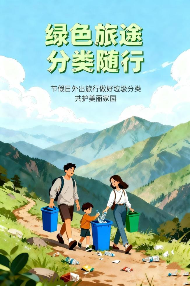 外出游玩:隨身攜帶折疊環(huán)保袋,野餐產(chǎn)生的果皮、剩食裝在廚余垃圾袋,礦泉水瓶、能量棒鋁箔袋歸為可回收物,濕紙巾、煙頭則放入其他垃圾袋,要做到“垃圾不落地,分類帶下山”。