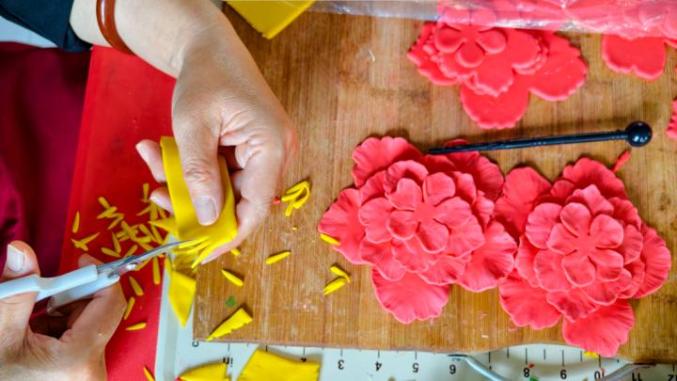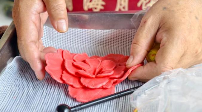 這時(shí),一旁的幫工也沒閑著,她們專注地揉制不同顏色的面團(tuán),順手捏出簡單面花,為月餅打底。