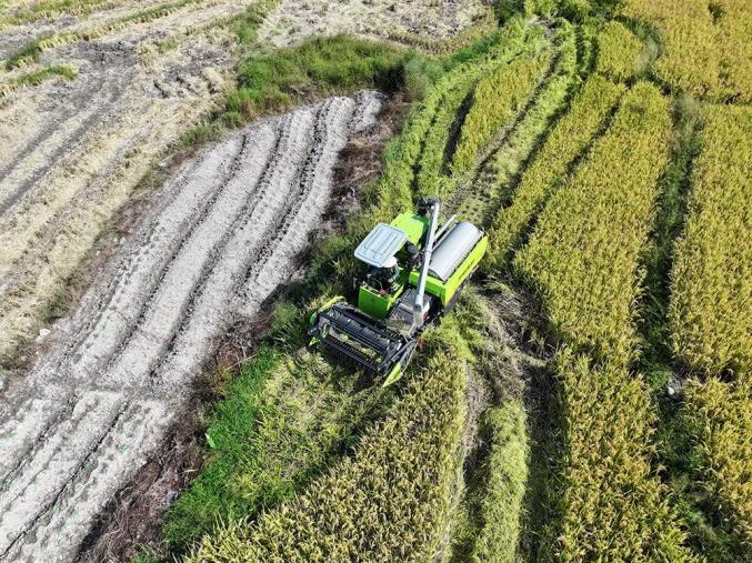 一臺大型收割機在稻田中來回穿梭,伴隨著轟鳴聲,切割、脫粒、裝車等工序一氣呵成,飽滿的稻谷被收入倉中,之后轉(zhuǎn)運到田埂旁的運糧車里。