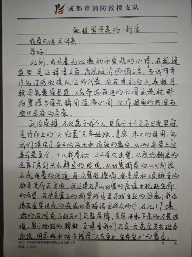 國慶假期,成都市消防救援支隊的胡楊和宜賓長寧縣消防救援大隊的徐華,兩位消防員飽含深情地給祖國母親寫下親筆信,字里行間都流露著對祖國的赤誠熱愛和對人民的無盡深情。