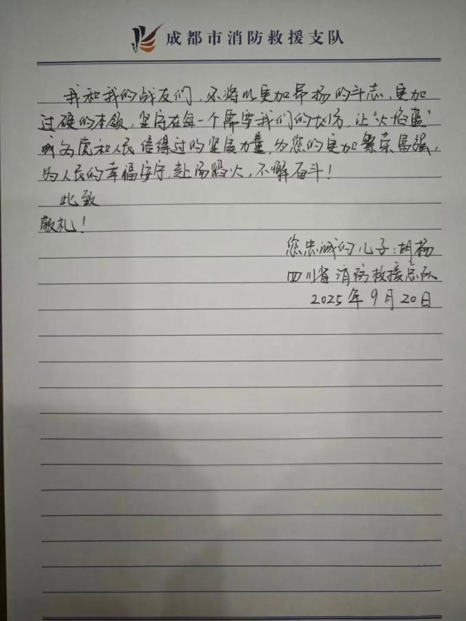 胡楊的信中,藏著他十九年的“逆行勛章”。自2006年穿上消防制服,他的人生就與警鈴、火海和險境緊密相連。三千多次出警記錄,是他穿越烈焰翻騰的倉庫、震裂的公路和湍急的洪流后留下的深刻印記。