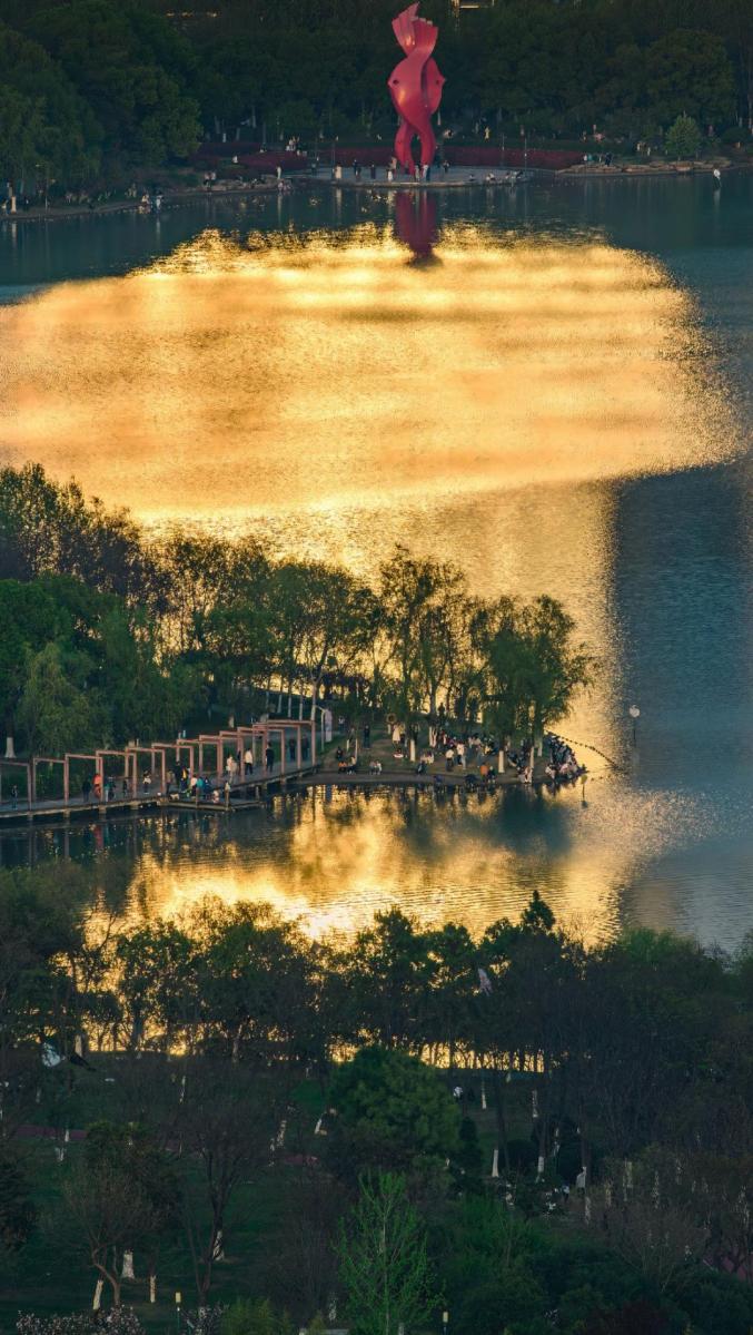 微風(fēng)從湖面吹來,帶著一絲難得的涼爽。白日里的喧囂正緩緩?fù)巳?,湖水顯得格外平靜,倒映著天空、高樓與即將上演的晚霞。此刻的湖畔,是屬于閑適與期待的。