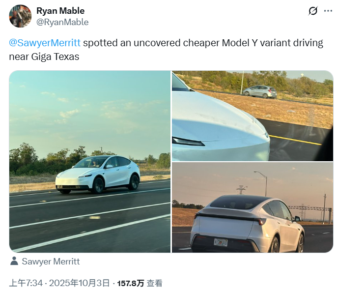 周一特斯拉股價也大幅上漲了5.45%。公司在社交媒體上多次預告,將于10月7日發(fā)布新品。同時,有美國網(wǎng)友在社交媒體爆料,在特斯拉得州工廠附近看到了沒有覆蓋偽裝的“平價版Model Y”。