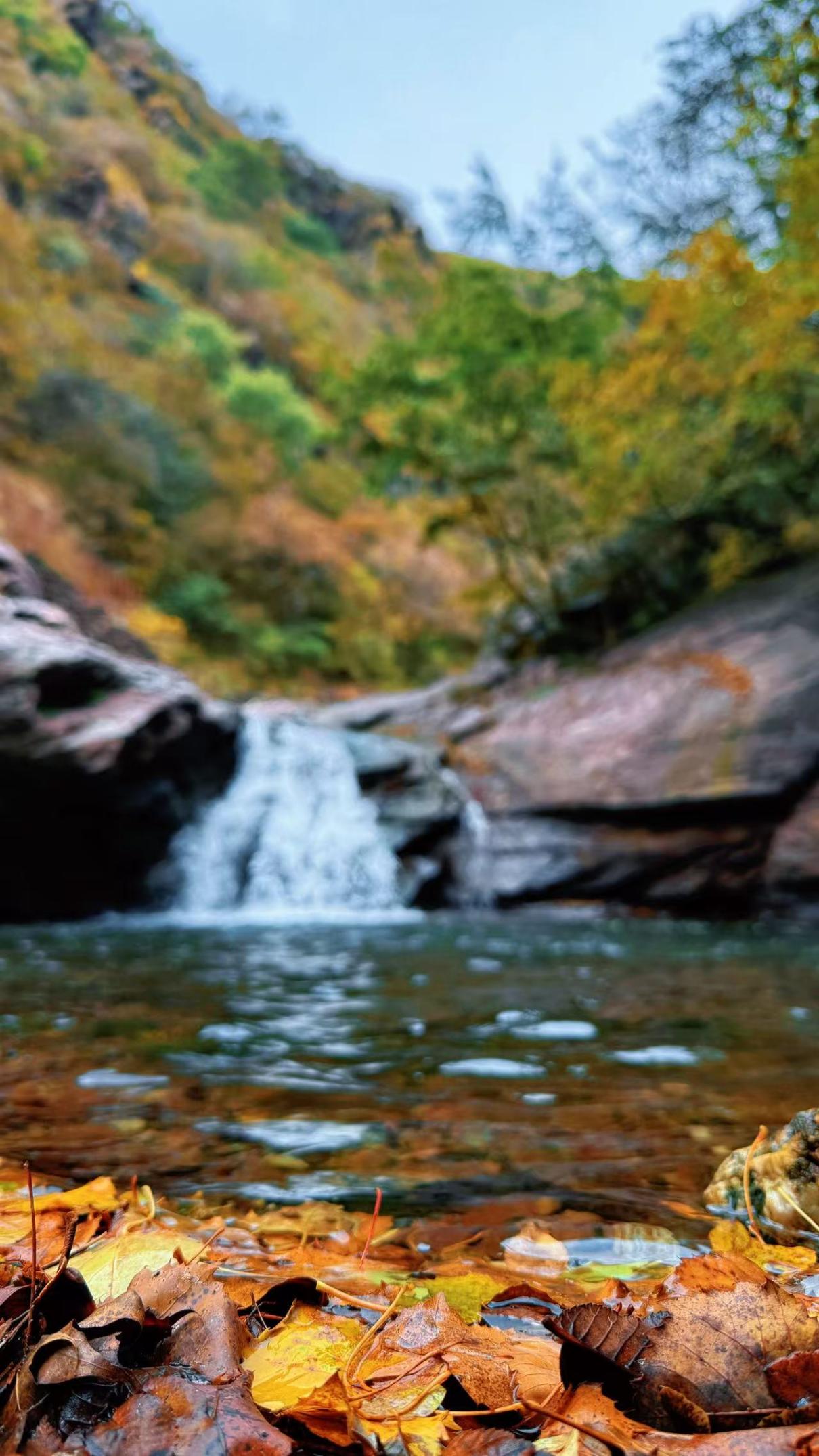 但我們一家更享受溯流而上的野趣。離開景區(qū)門口人流,進(jìn)入峽谷,仿佛進(jìn)入無人之境,越往里走秋色越濃。游玩中,在瀑布下打卡,在溪流中尋路,與自然融為一體。