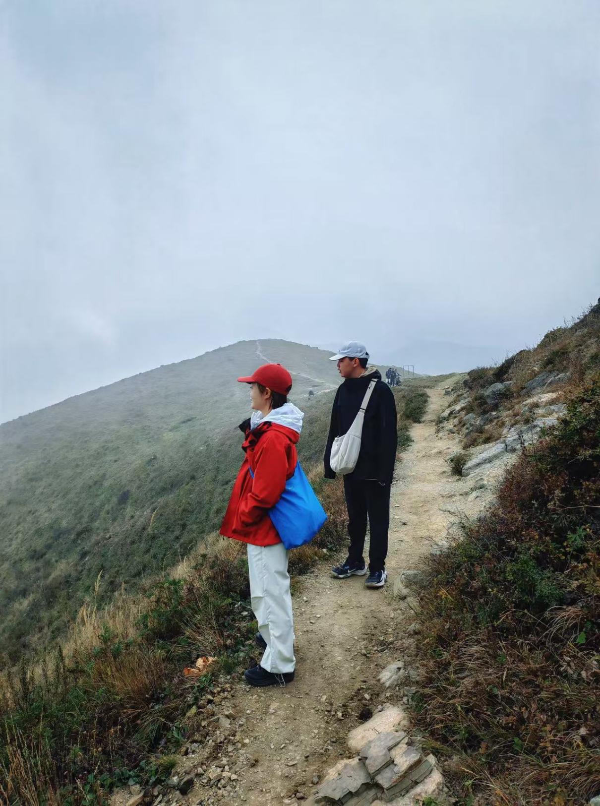 步行兩小時(shí),經(jīng)歷晴天、小雨、大霧。因大霧我?guī)状蜗敕艞壴贩祷兀珒鹤右宦穲?jiān)持,最終我們到達(dá)主峰山頂。站在海拔1950米峰頂,環(huán)視群山和草甸,心中滿是豪邁。