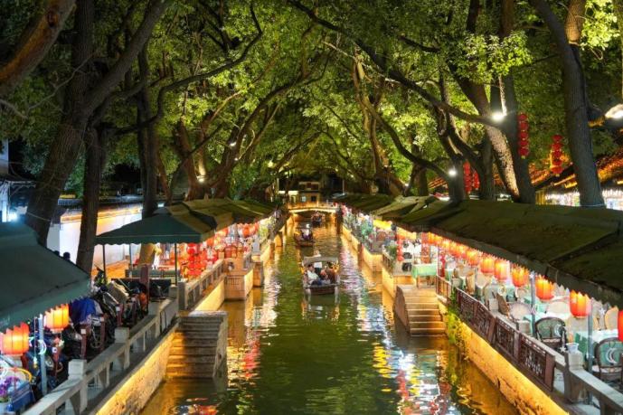 同里古鎮(zhèn)夜晚,暮色籠罩粉墻黛瓦,退思園光影交織,投影燈光與古典園林碰撞,如時空幻境。乘搖櫓船看兩岸燈火,穿過三橋,感受枕水江南的詩意。