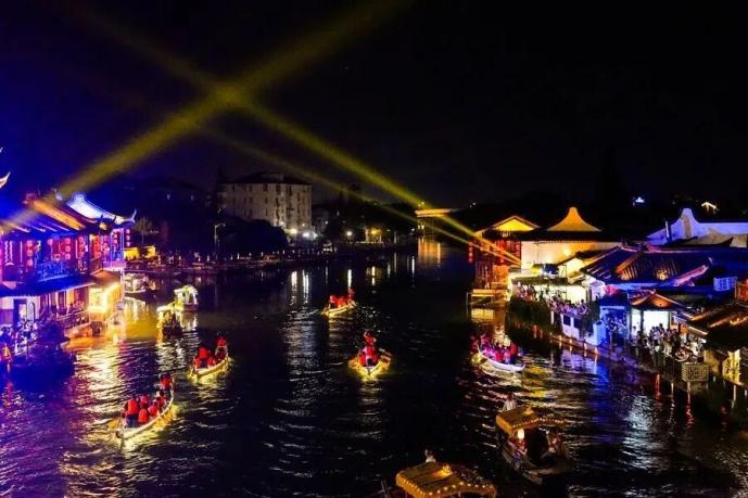 西塘古鎮(zhèn)的“夢西塘·船說”花船巡游,是一場國風(fēng)創(chuàng)意夜游盛宴。六艘主題花船點亮胥塘河,漢服巡游、國風(fēng)快閃等表演點燃熱情?;ù灿我怨沛?zhèn)歷史文化為創(chuàng)意,串聯(lián)古今,讓游客感受傳統(tǒng)文化與現(xiàn)代潮流的碰撞。