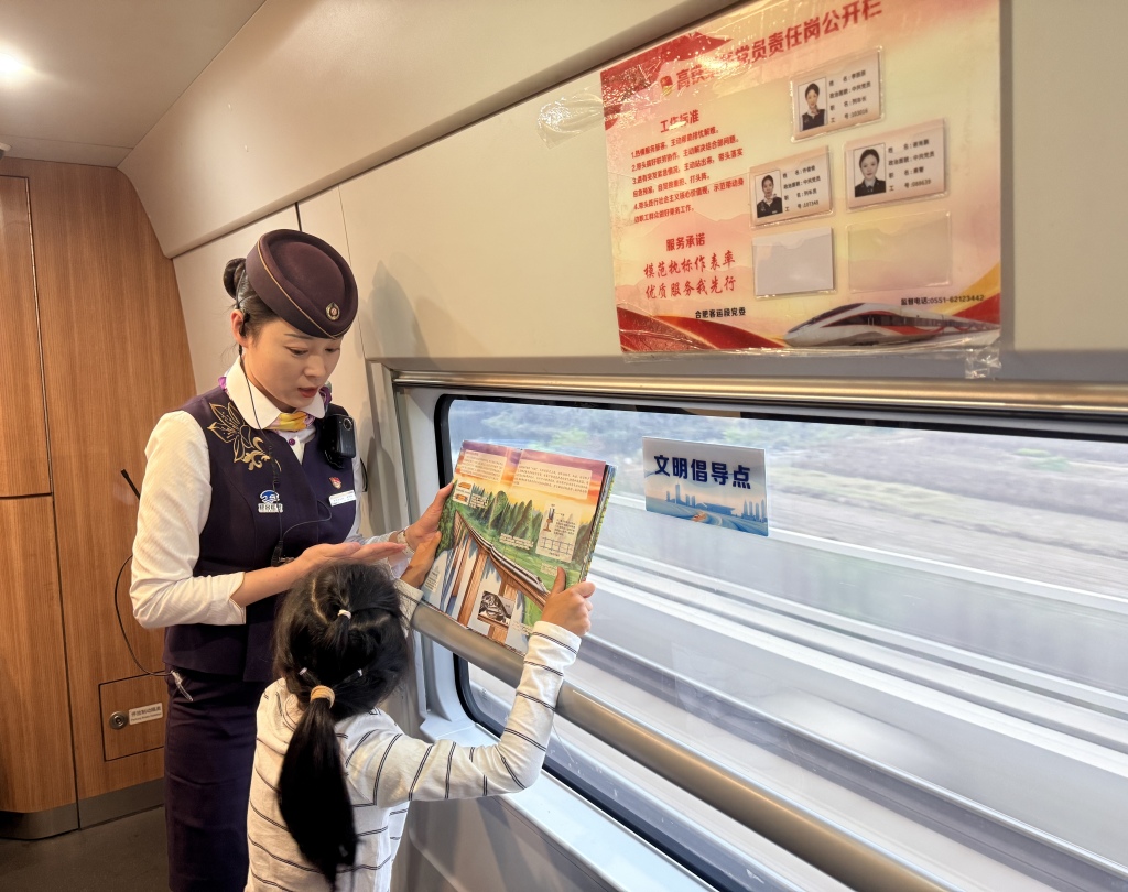 列車乘務(wù)人員向兒童宣傳文明出行須知