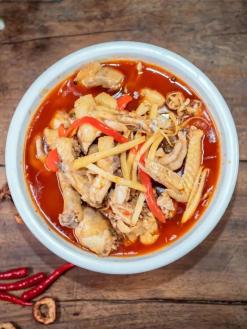 國宴菜譜之一,選用未產(chǎn)蛋雌雞為主料,配以生姜、紅辣椒、東安米醋等調(diào)料,經(jīng)煮、炒、燜工序而成。成品金黃透亮,雞肉嫩滑爽口,酸辣鮮香層次分明,是宴席上不可或缺的招牌美味。