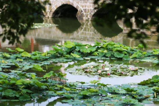 碧云池旁賞荷,此情此景當吟詩一首。碧云池因范公風骨與書院弦歌的浸潤,而彌漫著“清雅厚重”的文脈氣息。池畔有水榭曲廊蜿蜒,飛檐翹角倒映水中,與荷影相映成趣。