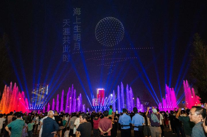 夜幕降臨,揚(yáng)州東站廣場(chǎng)上,700架無(wú)人機(jī)一同起飛,宛如流螢、星河,在夜空中有序排列、變換。它們不只是燈光,更像是靈動(dòng)的畫筆。先是勾勒出“我愛(ài)你中國(guó) 心愛(ài)的母親”,點(diǎn)燃了現(xiàn)場(chǎng)觀眾的愛(ài)國(guó)熱情;接著變換出“盛世華誕 家國(guó)同慶”,營(yíng)造出濃厚的節(jié)日氛圍;隨后,“揚(yáng)州好地方”的城市名片閃耀夜空,展示著城市的自信與魅力;國(guó)產(chǎn)戰(zhàn)機(jī)“殲15”與“華東航空谷”的造型相繼出現(xiàn),彰顯了揚(yáng)州在高端制造、航空產(chǎn)業(yè)與低空經(jīng)濟(jì)領(lǐng)域追求前沿、奮勇向前的決心。