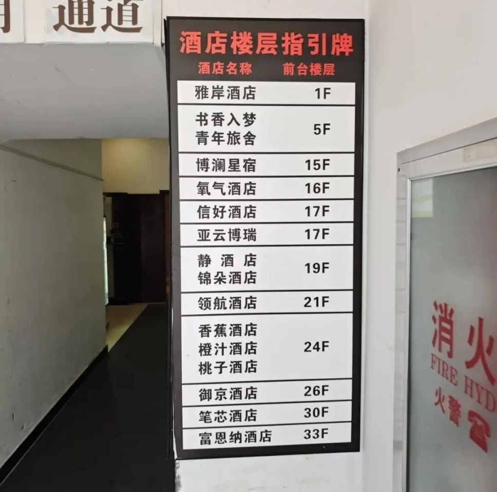 這種“拼租”式開店在酒店圈迅速流行起來。以杭州的一棟高層大樓為例,整棟樓里分布著十多家酒店,幾乎達(dá)到“每層一家”的密集程度。更有甚者,部分公寓樓里多家酒店共用一個大堂,僅通過樓層來區(qū)分。