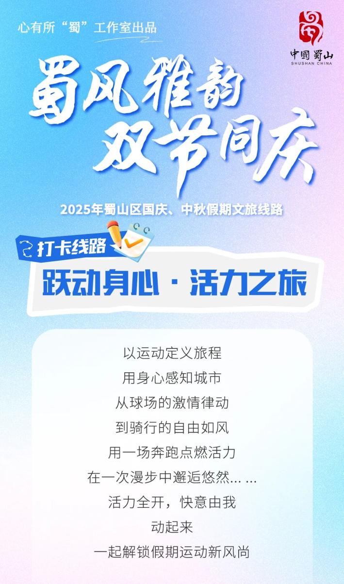 在蜀山區(qū),無(wú)論是城區(qū)里隨處可見的體育運(yùn)動(dòng)設(shè)施,還是各類細(xì)分的體育運(yùn)動(dòng)場(chǎng)館,每一項(xiàng)運(yùn)動(dòng)都能找到最適宜的空間。這個(gè)假期,讓我們放慢腳步,投身戶外運(yùn)動(dòng),放松身心,盡情享受自然之美、運(yùn)動(dòng)之趣,開啟一場(chǎng)與旅途之悅完美融合的快樂(lè)假期。