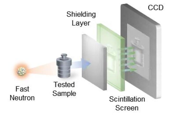 在快中子成像系統(tǒng)中,閃爍屏同樣充當(dāng)著“翻譯官”的角色??熘凶哟┻^(guò)被檢測(cè)物體,帶著物體內(nèi)部結(jié)構(gòu)信息撞擊到閃爍屏上。閃爍屏里含有氫含量豐富的特殊物質(zhì),受到中子撞擊后會(huì)產(chǎn)生高速運(yùn)動(dòng)的質(zhì)子,也就是反沖質(zhì)子。這些質(zhì)子把能量沉積到閃爍屏中的發(fā)光中心,最終激發(fā)出可見(jiàn)光,這些可見(jiàn)光被相機(jī)捕捉后就形成了我們看到的圖像。