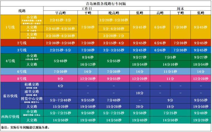 同時,為了匹配市民的出行需求,青島地鐵優(yōu)化了運力配置,各線路工作日、周末的行車間隔均有調(diào)整。其中,工作日20:20之后,原藍谷快線部分由苗嶺路站始發(fā)、終到博覽中心站的小交路列車,終點站將調(diào)整為浦里站。