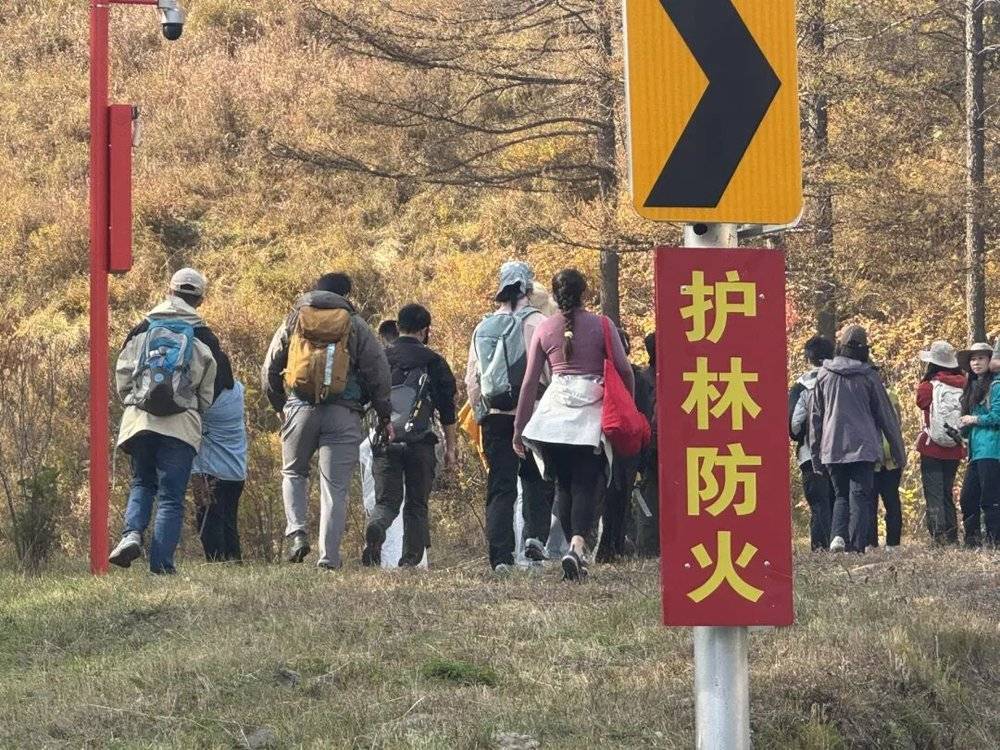 當(dāng)時(shí)我們已經(jīng)駛過(guò)景區(qū)大門(mén),門(mén)口有穿黃綠色反光背心的工作人員和一位身著橘色服裝的消防員,他們向每輛車發(fā)放“禁止攜帶火種”的提示。這是我最后一次在塞罕壩看到“工作人員”。