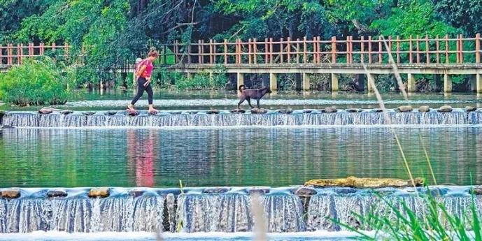 村民從響土村河間的跳巖上走過。海南日報記者 陳元才 攝