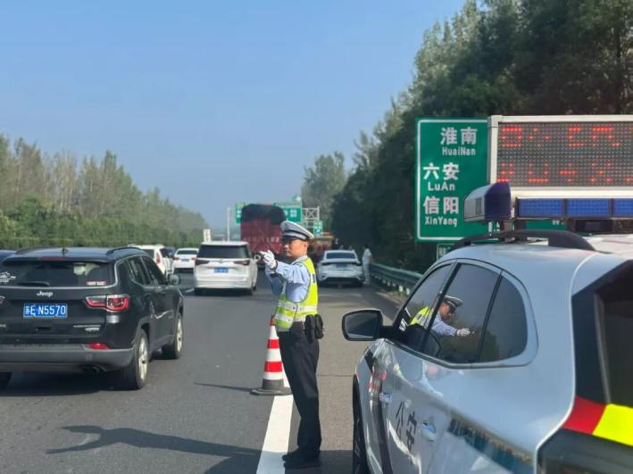 10月6日,交管支隊(duì)高速三大隊(duì)民警在繞城高速淮南方向進(jìn)行交通指揮疏導(dǎo),全力保障返程高峰的交通安全。