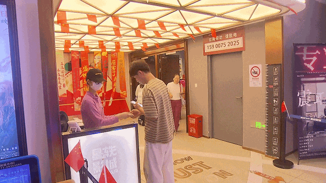 除了有優(yōu)質(zhì)的影片,影院在服務(wù)體驗(yàn)方面也花了很多心思。記者發(fā)現(xiàn),在傳統(tǒng)的影廳標(biāo)識(shí)旁邊,都掛上了“人民幸福廳”“我愛(ài)你中國(guó)廳”“‘程’功人士廳”等充滿節(jié)日氛圍的限定名牌。這個(gè)貼心的設(shè)計(jì)讓觀眾一走進(jìn)影院就能感受到濃厚的節(jié)日氣氛。在“人民幸福廳”觀看合家歡電影,不只是一次娛樂(lè)消費(fèi),更成了一種情感共鳴和價(jià)值體驗(yàn)。