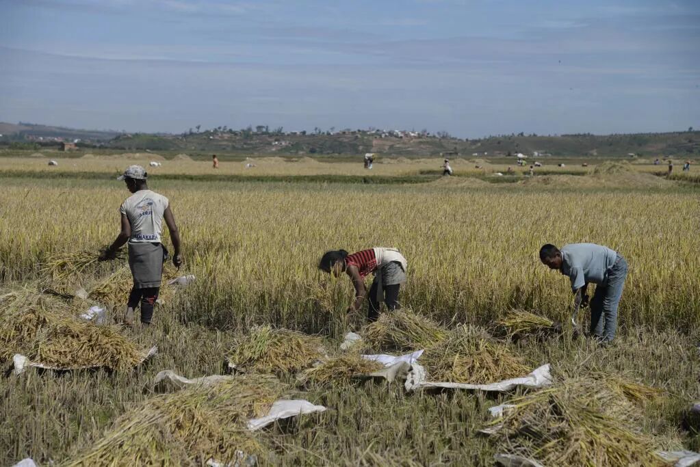在馬達(dá)加斯加首都塔那那利佛附近馬希奇鎮(zhèn)的中國國家雜交水稻工程技術(shù)研究中心非洲分中心,當(dāng)?shù)剞r(nóng)民在雜交水稻高產(chǎn)示范田內(nèi)收割水稻