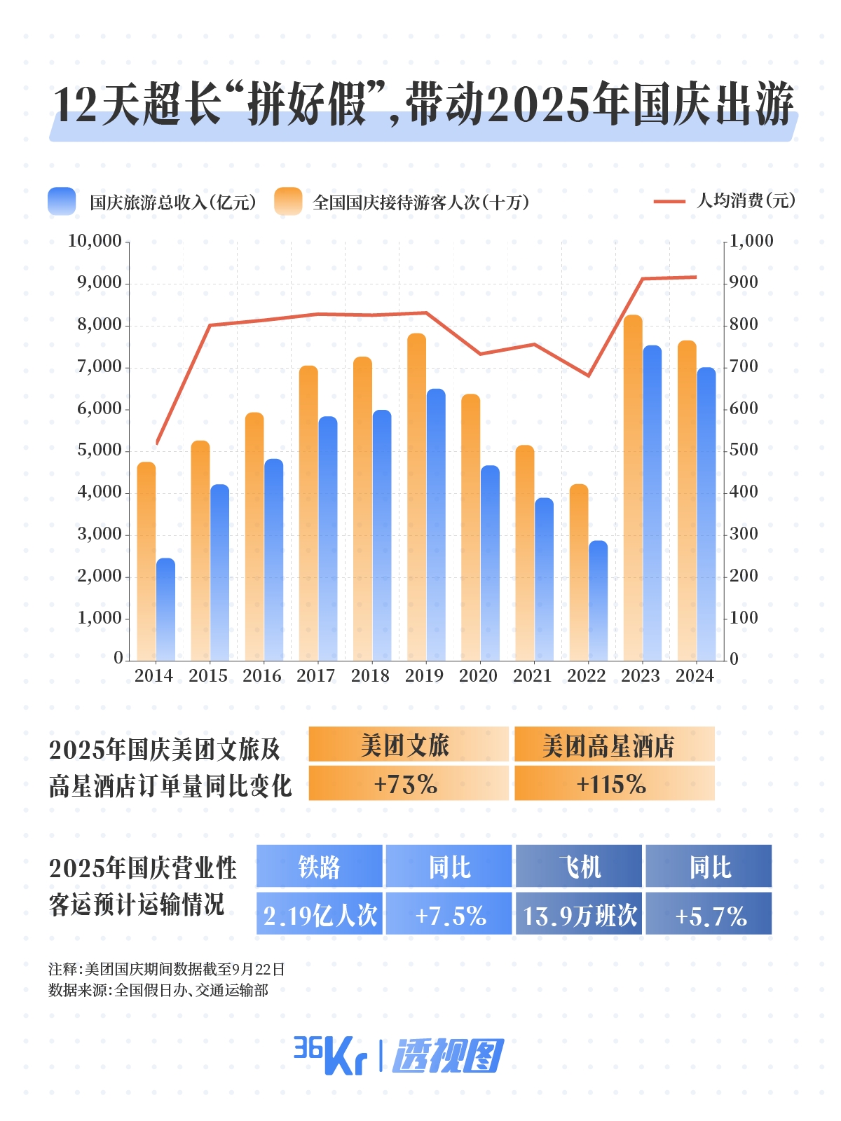 交通運(yùn)輸部預(yù)測,2025年國慶中秋假期期間(9月29日至10月10日),全國鐵路預(yù)計(jì)發(fā)送旅客約u200c2.19億人次u200c,較去年同期增長7.5%;民航預(yù)計(jì)執(zhí)行客運(yùn)航班總量13.9萬班次,日均同比增長5.7%。多個(gè)旅游平臺(tái)也顯示,今年假期出游的人數(shù)同比大幅增長,旅游和消費(fèi)或?qū)⑦M(jìn)入全面的高峰期。