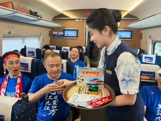 南昌局集團公司精準服務,把“球迷專列”打造成移動的“觀賽派對”。列車布置“贛超”主題車廂,部分列車通過設置球迷互動角、觀賽打卡區(qū),組織足球知識問答、助威口號接力活動,提供手舉牌、加油棒等應援道具,營造濃厚觀賽氛圍。