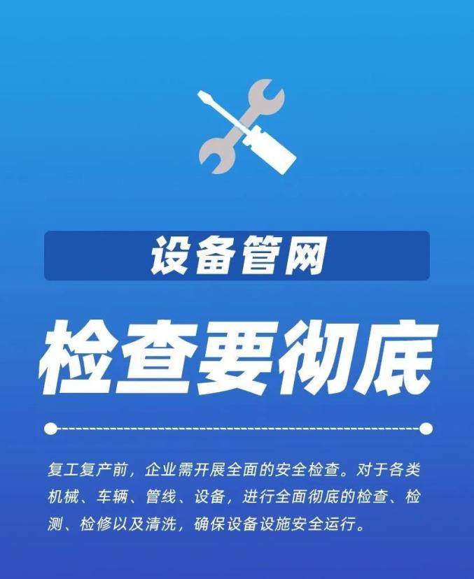 假期里,防護設(shè)施、機械設(shè)備、電線電路停用時間較長,容易受到銹蝕或被咬噬,從而影響安全性。復工時要對機器設(shè)備進行詳細檢查和維護。