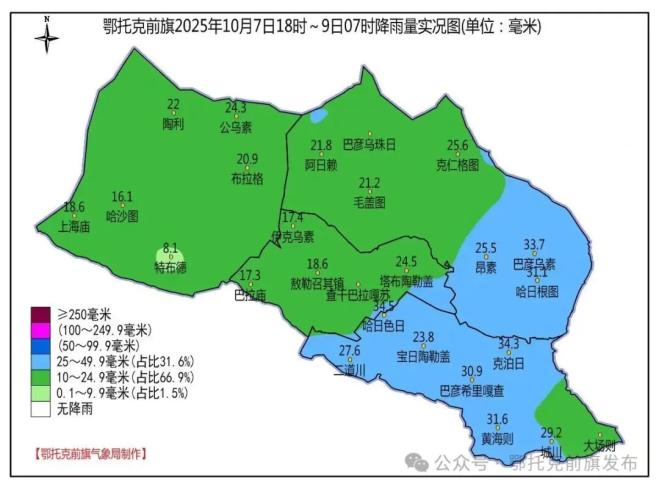 【鄂前旗氣象臺】10月9日07時發(fā)布降雨實況信息(單位:毫米):7日18時至9日07時,本旗出現(xiàn)降雨天氣,最大降雨量出現(xiàn)在哈日色日,達34.5毫米。各地降雨量如下: