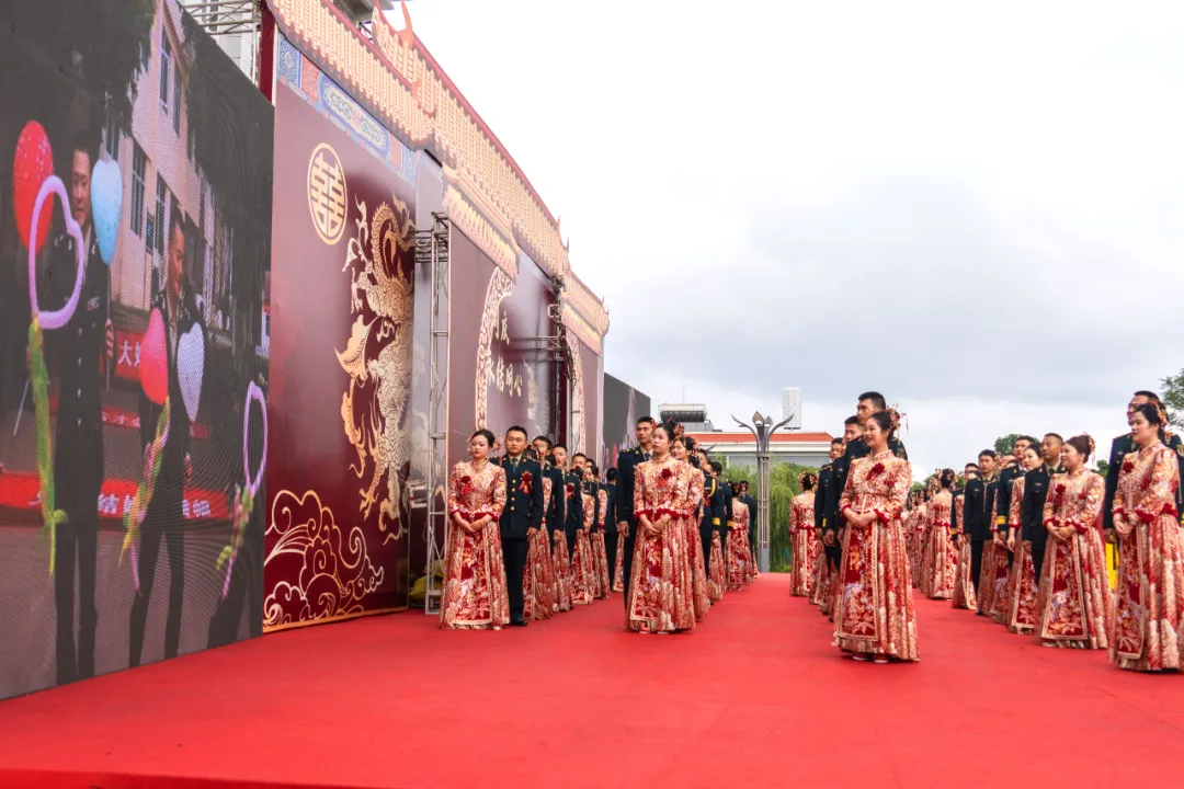 50對新人在親朋好友和戰(zhàn)友們的共同見證下,攜手踏上了象征幸福的紅毯,參加了這場名為“家國同慶·永結(jié)同心”的集體婚禮。