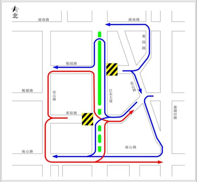 施工期間,重陽路路口將按照“T”型交叉口進行交通組織,過往車輛可借助雨山路、佳山路等路網繞行;菊園路路口東側交通將中斷,進出車輛可通過花山路和湖南路等路網繞行。