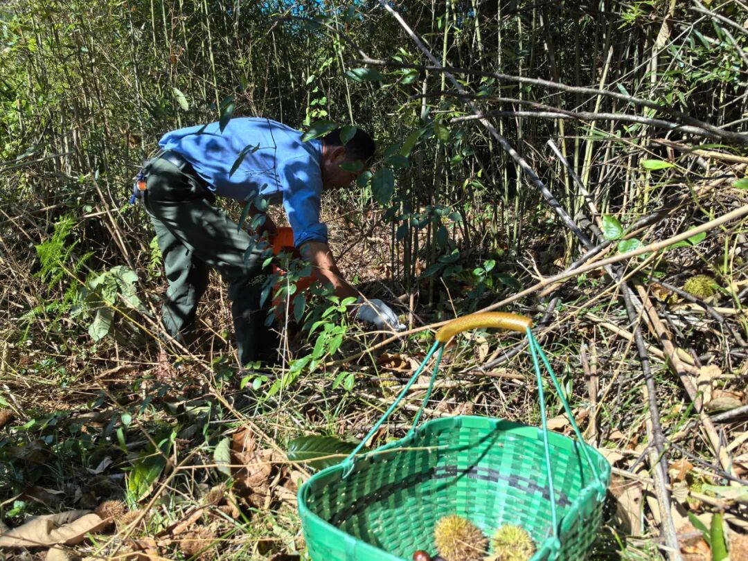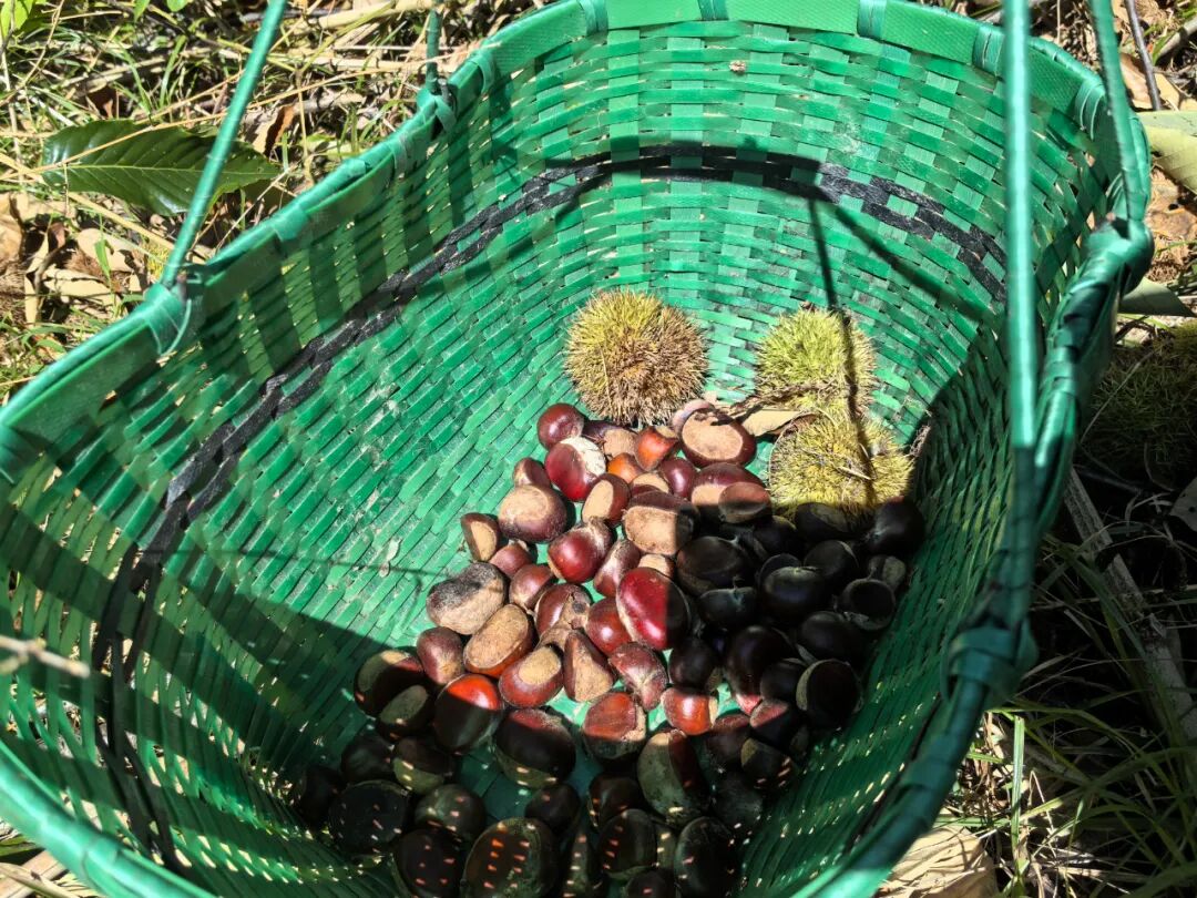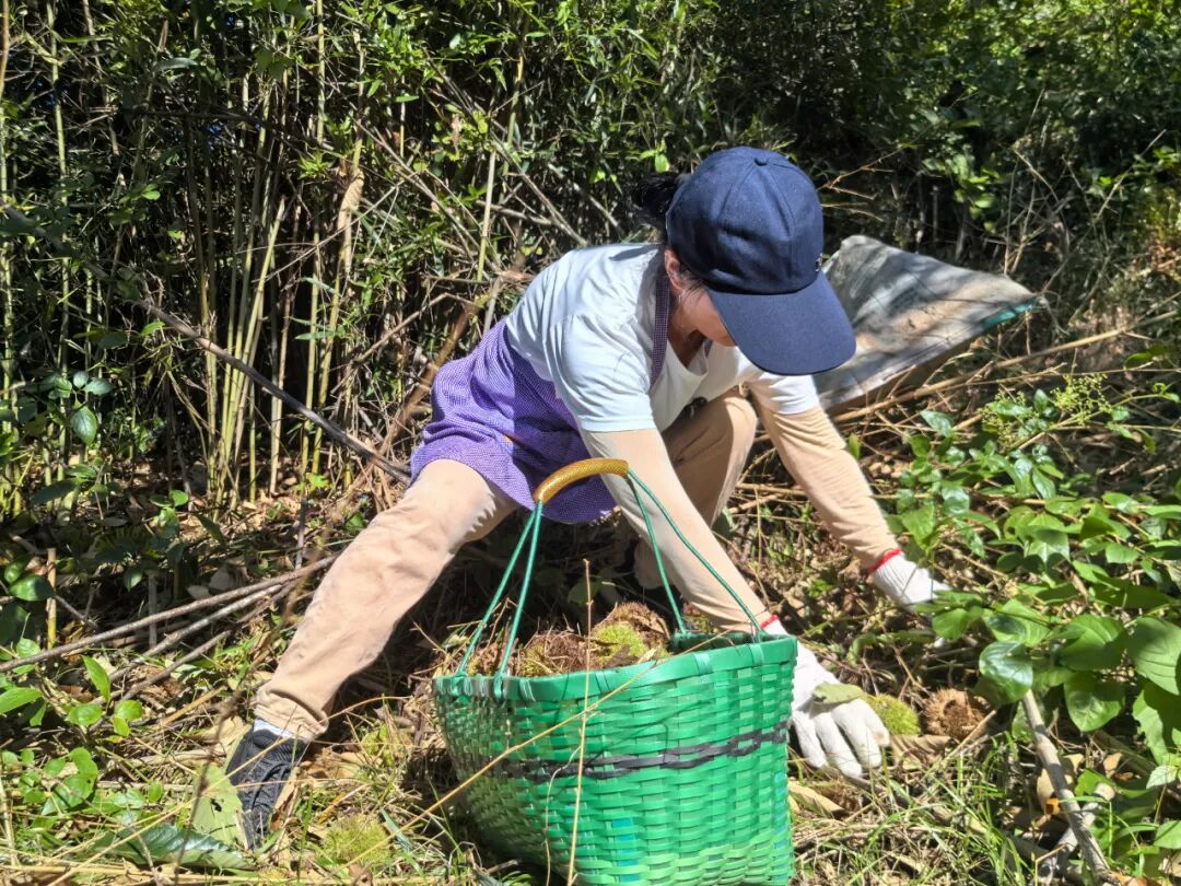 一旁等候的親友迅速走到林下,扒開草叢,將掉落的板栗一一撿起裝袋。隨后,大家?guī)еS收果實(shí)回到沈家。