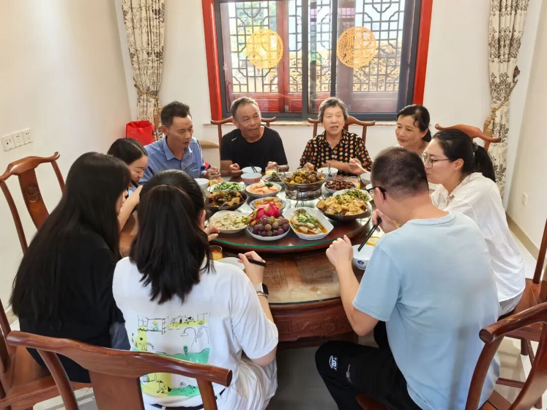 擺好碗筷,一桌中秋佳肴陸續(xù)上桌,板栗燒雞作為最重要的一道菜最后端上飯桌,香氣瞬間彌漫整個(gè)小院。親友們圍桌而坐共享美味,甜糯板栗混合著雞肉的鮮香,讓團(tuán)圓增添了幾分獨(dú)特的煙火氣。