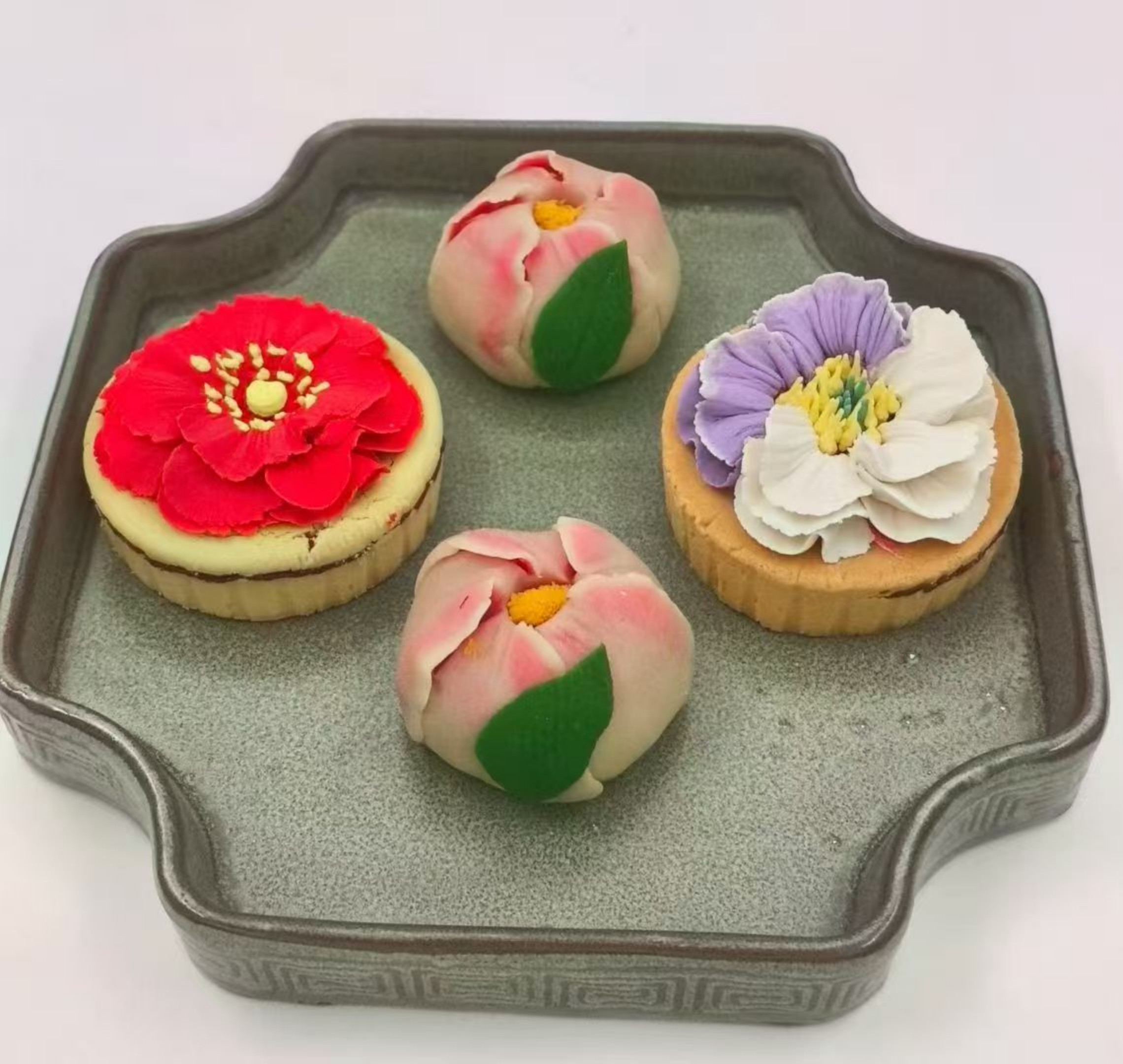 “曹州花相酥”以當(dāng)?shù)厥a(chǎn)的芍藥作為核心創(chuàng)意原料,選取新鮮的芍藥花瓣經(jīng)過兩個月的醬制,再運用傳統(tǒng)酥點工藝制作成型,生動地還原了芍藥含苞、綻放等六種不同的花姿。其外皮酥脆香甜,內(nèi)餡清甜可口,既保留了花瓣的自然芬芳,又結(jié)合現(xiàn)代口味進行了科學(xué)配比,最終呈現(xiàn)出六款在視覺和味覺上都很有特色的產(chǎn)品。糕點表面的雕花十分細膩,芍藥的形態(tài)鮮活立體,與中秋團圓、國慶歡慶的節(jié)日氛圍非常契合。